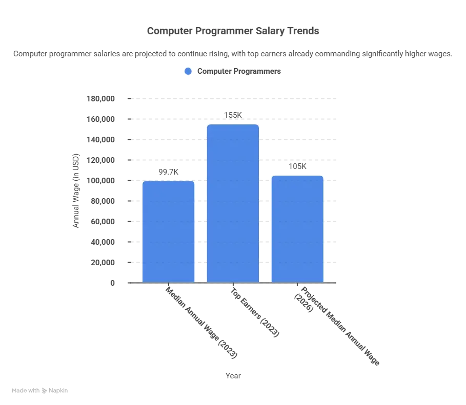 The financial rewards of a programming career are significant. According to the U.S. Bureau of Labor Statistics, the median annual wage for computer programmers in the United States was $99,700 in 2023, with top earners surpassing $155,000. In 2026, those numbers continue to rise, especially in artificial intelligence, cloud infrastructure, and cybersecurity roles.